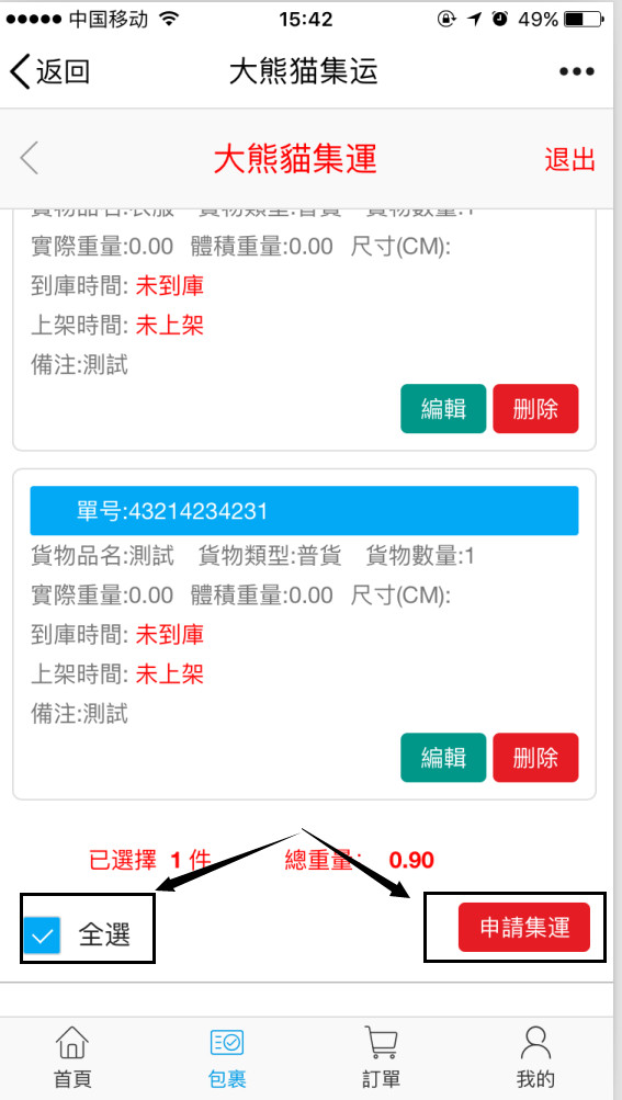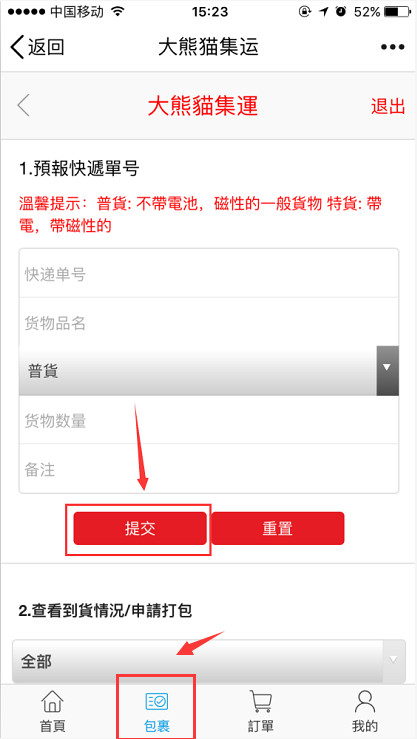 第五步:快遞到達(dá)集運(yùn)倉后,集運(yùn)系統(tǒng)會主動通知您可進(jìn)行申請打包